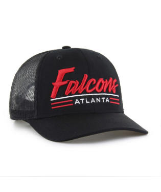 ATLANTA FALCONS SCRIPT NAME BLACK TRUCKER HAT, GARNER TRUCKER, ADJ